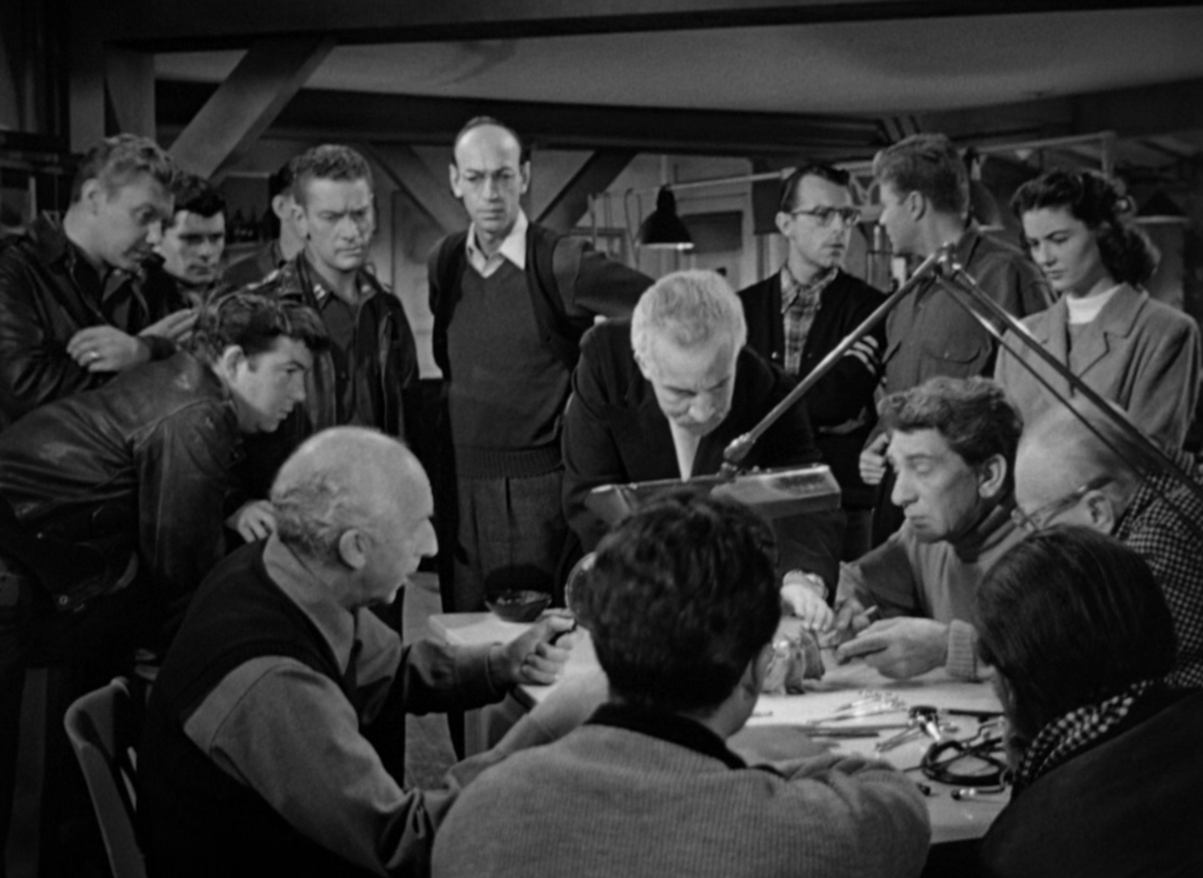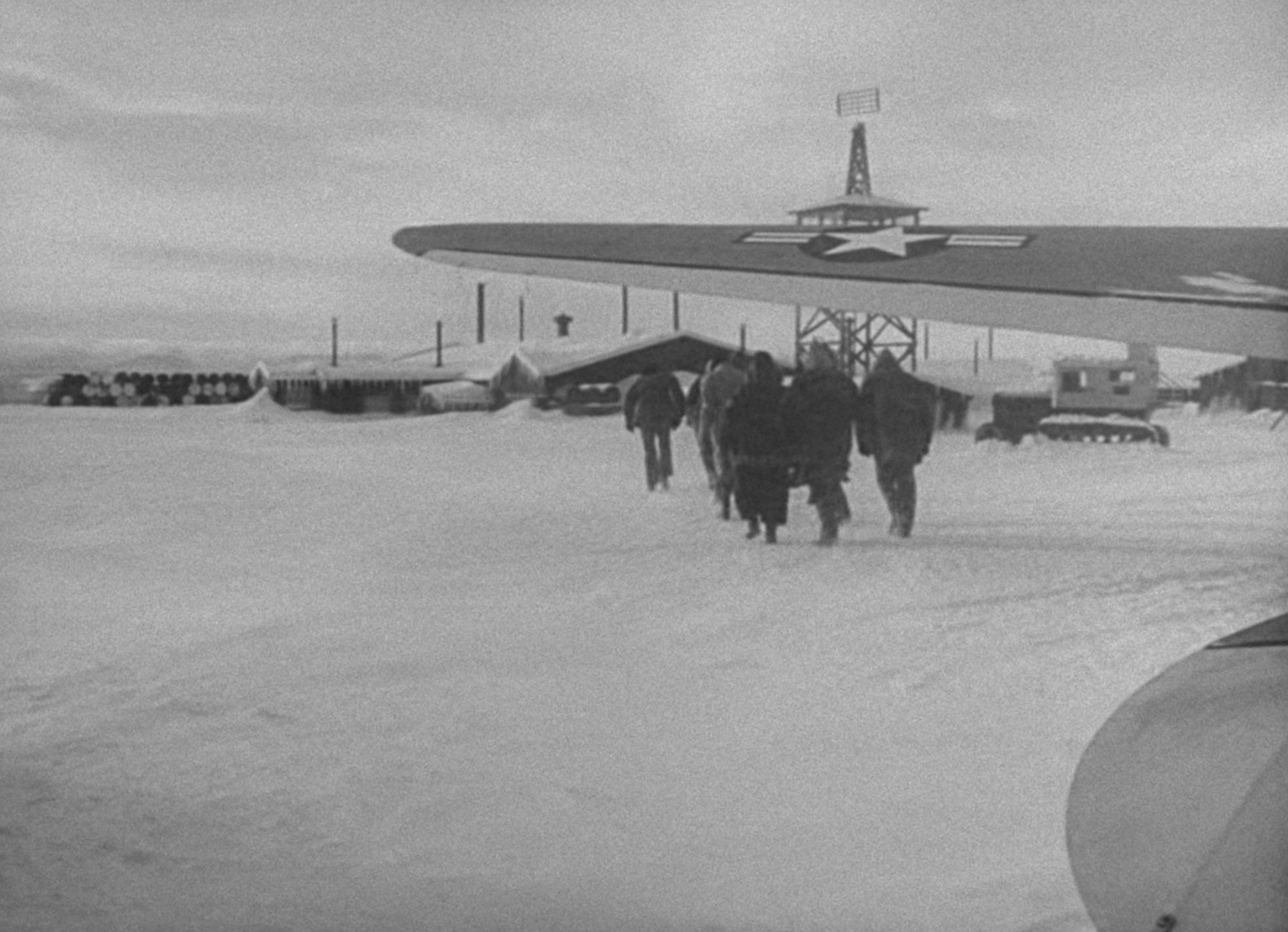 Abb. 13 Forschungsstation „The overall design of a setting can shape how we understand story action“ (Bordwell/ Thompson 2008, S. 117) Es ist laut Bordwell und Thompson also sehr wichtig neben der Narration auch auf den vorgegebenen Handlungsort zu achten, da uns dieser wertvolle Information über die Situation, den Beziehungen untereinander oder das allgemeine Verständnis der Handlung gibt. (vgl. Bordwell/ Thompson 2008, S. 117) Beispielsweise liefert uns “The Thing” aus 1951 überwiegend Szenen aus den Innenräumen des Forschungszentrums, was zum einen natürlich den technischen Grenzen aus diesem Jahrzehnt geschuldet ist, zum anderen aber auch den Fokus auf den Charakteren und dessen Beziehungen setzen soll. Der Film ist dabei sehr inhaltsbasiert und setzt sehr viel auf Dialogen, welches sich demnach auch anhand des Settings oder besser gesagt des Framings widerspiegelt.